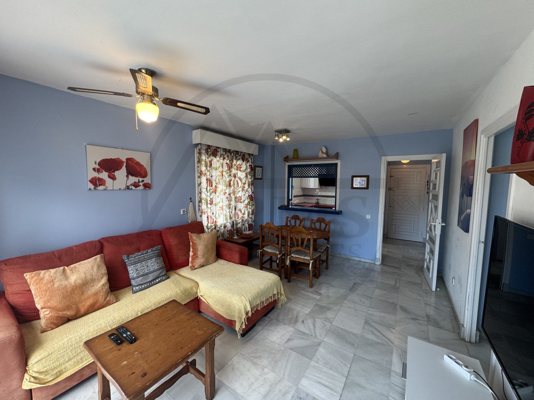 The property is on the first floor and has a spacious living room with an open-plan kitchen, a large bedroom and a full bathroom, both of which were renovated just a year ago, combining modern style with functionality.